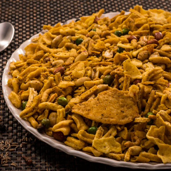 Navratan Mixture is a popular Indian snack that combines a variety of ingredients to create a flavorful and crunchy mix. It typically includes roasted nuts such as peanuts, cashews, and almonds, along with crispy sev (a type of fried noodle made from gram flour), puffed rice, and fried lentils. The mix is seasoned with a blend of spices, including turmeric, chili powder, and cumin, and often garnished with curry leaves and fried green chilies. This combination of ingredients provides a delightful contrast of textures and tastes, making Navratan Mixture a favorite choice for snacking.